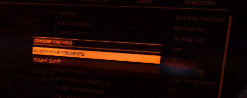 また、只CONFLICT ZONE内で戦闘を行うだけでは要求条件を満たせません。 CONFLICT ZONE内に入ったら、右のパネルのFUNCTIONタブの一番上、「FACTION」の項目を選び、どちらの勢力側で戦うかを選択します。 コミュニティゴールの要求通りの勢力側を選びましょう。 勢力を選ぶと敵対勢力がレーダー上で赤く表示されますので、戦闘し、撃墜して下さい。 撃墜するとCombat Bond Voucher(戦闘債権証票)が貰えますので、ステーションで交換して下さい。 その金額が貢献度としてカウントされます。