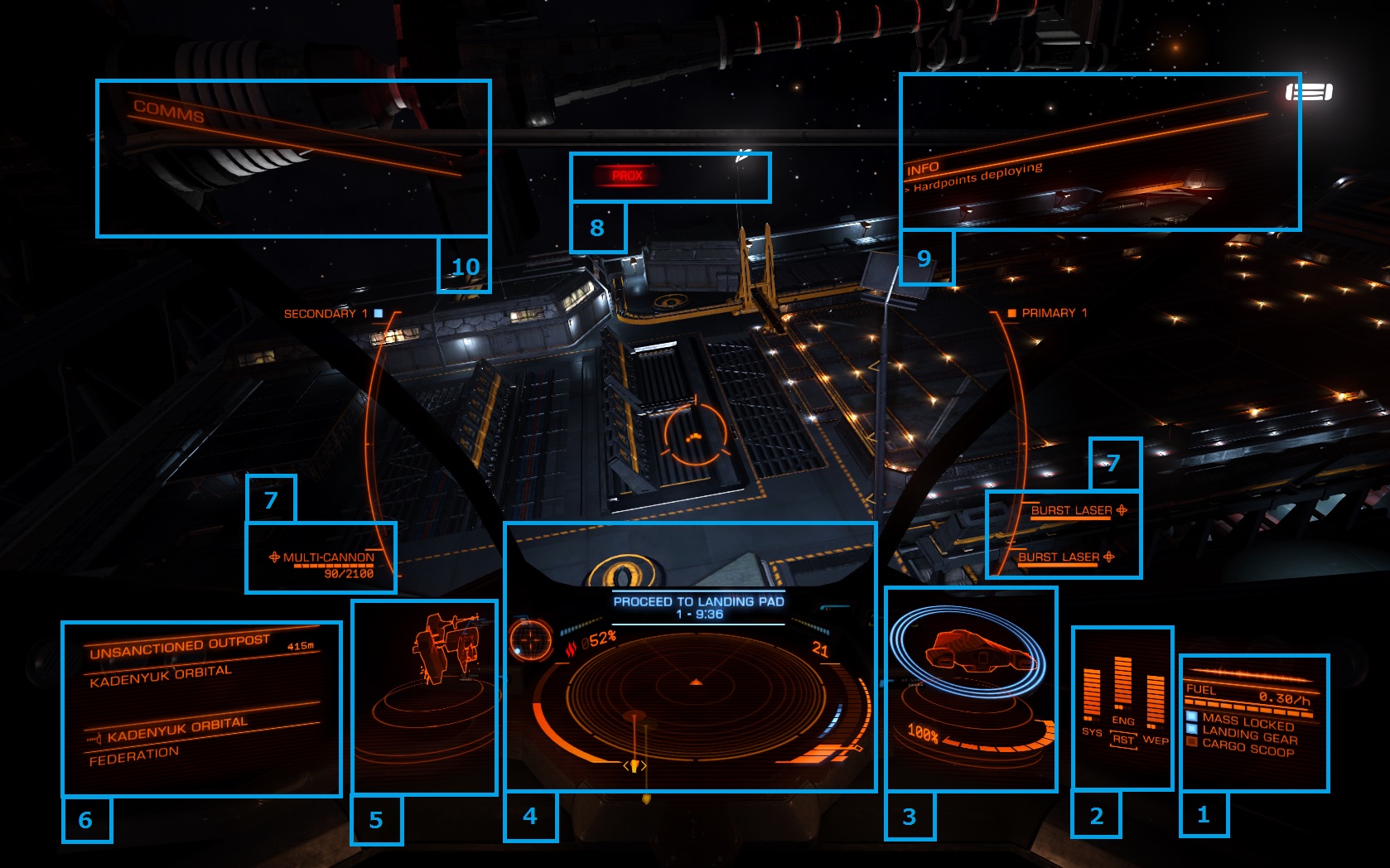SPEED INDICATOR SCANNER右側に位置し、自機のスピードに関する情報を表示する。 中央の一番太い点線が現在の速度を示し、上部に数字でも表示される。 右側(外側)の点線はスロットルを示し、デフォルトではキーボードの「W」キー及び「S」キーでスロットルを操作した際に現在のスロットル開度を横棒で表示する。スロットルは船体に装備されるエンジンやPOWER DISTRIBUTORでのリソース配分によって点線の長さが前後する。 左側(内側)の青い点線はスイートスポット(sweet spot)を示し、自機のスピードがこの点線内にあるとその機体の最適な機動性が得られたり、最小回転半径での旋回を行うことができる。 なお、「FSD光速移動時 & 目的地をターゲットに指定済み」の場合青ゲージにスロットルを合わせるとそこに到着するまでの間、自動的に速度調整を行なってくれる。 SCANNER これがレーダー。近くの惑星や機体などを表示してくれる。 ドッキング時には画像の様に、ドッキングスペースの番号と制限時間が表示される。 SENSOR SCALE SCANNER下部に表示される黄色の四角で、SCANNERのセンサー範囲を示す。一番左端が最小、一番右端が最大を示す。センサーの範囲を広げるとより多くの対象物を確認できるようになるが、SCANNERに表示されるかどうかは対象物の熱量(heat signnature)に依存する。 INTERNAL HEAT LEVEL SCANNER左側に位置し、自機の機体温度に関する情報を表示する。 航行時など機体が作動している間はパワープラント(power plant)が燃料を消費する際に一定の熱量が生成され、FSDを使用した際はより多くの熱量が発生する。また機体内部からの熱だけでなく、恒星の近くを航行する際も恒星が発生させる熱の影響を受けるため機体温度が上がる。100%を超えると機体にダメージが発生する可能性が上がるため早急に下げる必要がある。 NAV-COMPASS SCANNER左上部に表示される小さな円状のもので、ターゲットに指定した対象物(惑星、ステーション、船など)と自機との位置関係を表示する。対象物が自機の真正面に来た場合は、明るいドットが円の中央に表示される。