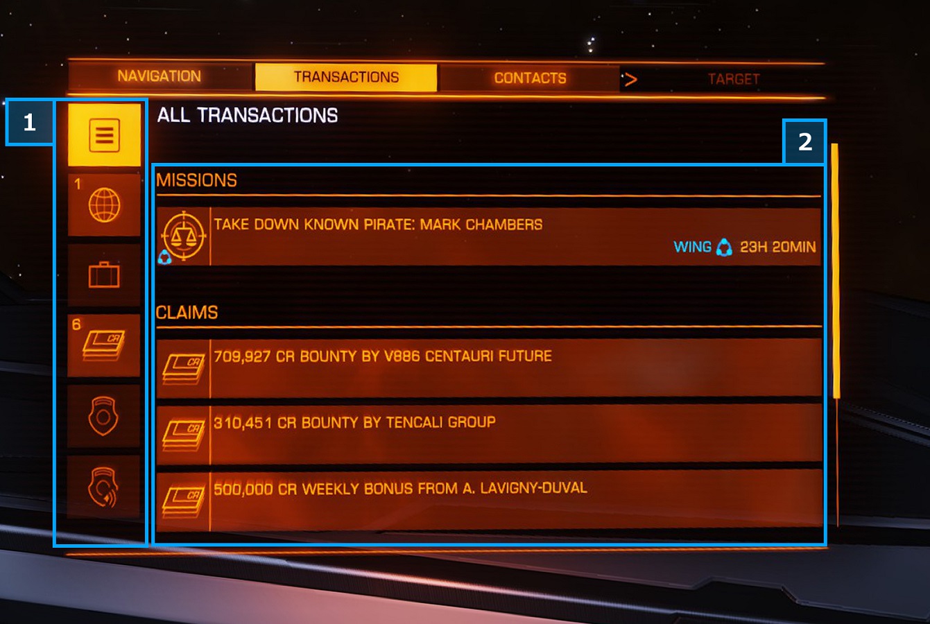 CLAIMS(請求書) NPCやCMDRに掛けられた懸賞金の獲得権利書一覧。ここに表記されている額が、対象の勢力ステーションにて受け取り可能である。受取期限は一切ないが、自船自体が撃沈されてしまうと「その時点までに獲得した懸賞金」請求権が全てリセットされて受け取れなくなってしまうので注意されたし。