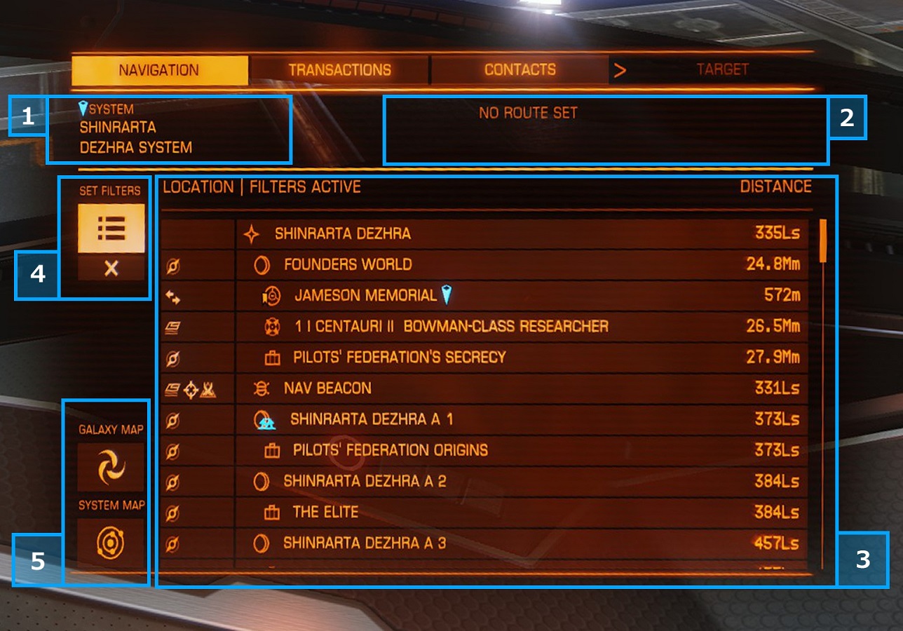 自船を中心にした近辺の「星系・惑星・アステロイドベルト(採掘場)・ステーション・恒星・CONFLICT ZONE・NAV BEACON等」が表示される項目。 左の『LOCATION』欄に惑星やステーションなどの名称が、右の『DISTANCE』欄には自船から各「LOCATION」までの距離が表示され、自船の位置は『LOCATION』欄内に『▼』マーカーで表示される。『LOCATION』欄の名称を選ぶと「選択メニュー」が表示され、移動先を選ぶと『LOCATION』欄内に『▼』マーカーが表示されるようになっている。 全ての詳しい項目は以下の通り。 Nav Beacon 星系 恒星 惑星 アステロイドベルト(資源採掘宙域) ステーション(Outpost型) ステーション(Starport型) 居留地 地上ステーション Conflict Zone Tourist Site Fleet Carrier