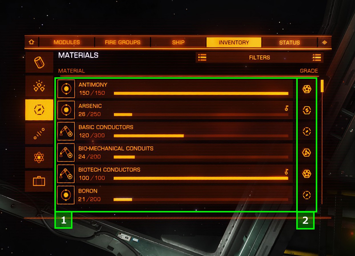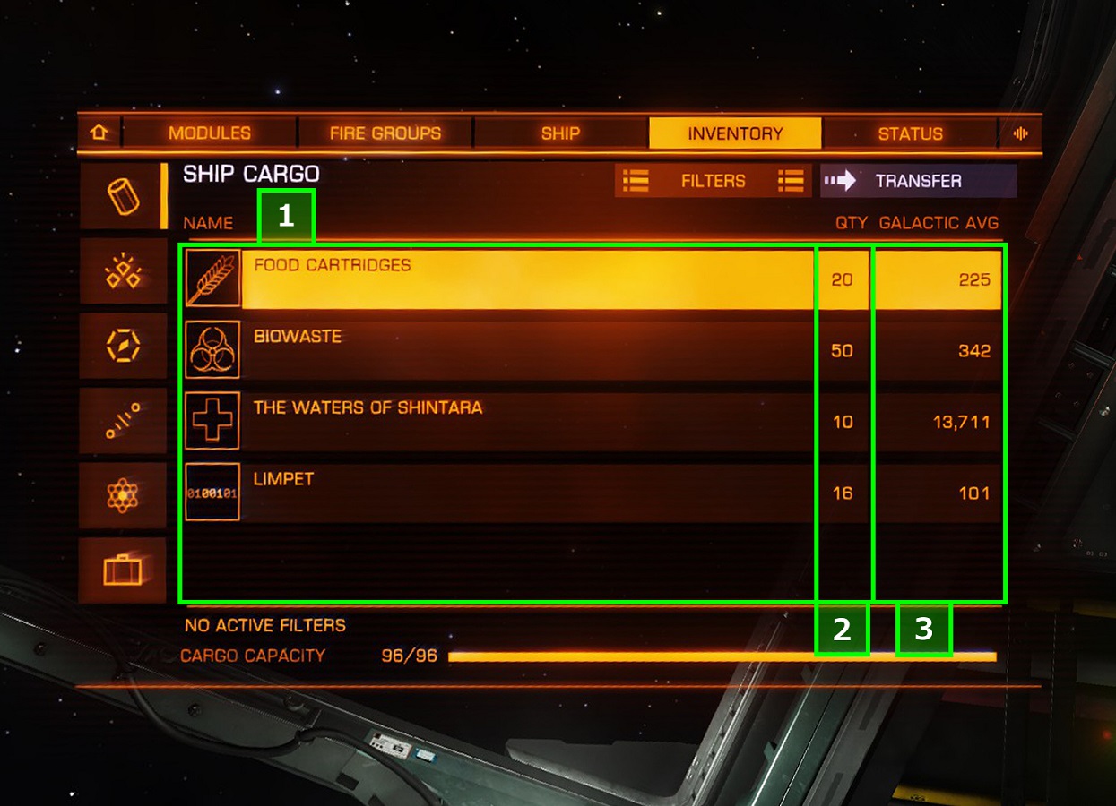 FILTERS 特定のカーゴ内物品をフィルターによる可視・不可視を変更可能。 項目は以下の通り DAMAGING 不明。※要編集 ILLEGAL 禁制物品のみ表示 MISSION ミッション物品のみ表示 POWERPLAY 不明 ※要編集 STOLEN 盗難品のみ表示