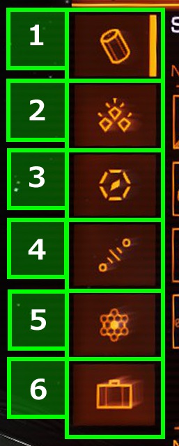 船に搭載されている展開装備や武装のグループ分け設定画面。戦闘では2つの武装発射キーが設定されており、片方の発射キー毎に武装を変えることが可能である。 セットは複数設定可能で、3~4以降のグループを設定した場合、戦闘中に「グループ切り替えキー」を押して切り替える。 例) 発射トリガー「1」にシールド無力化用のPulse Laserを設定し、発射トリガー「2」に装甲貫通用のMulti-cannonをセットする。 発射トリガー「3」に熱源ミサイルのTorpedo Pylonを設定し、発射トリガー「4」に照準ロック妨害用にChaff Launcherをセットする。 等 攻撃や防御用の『補助装備』の一部もここでセット管理される。「戦闘前に起動する装備」「戦闘中に起動する装置」をまとめると便利。