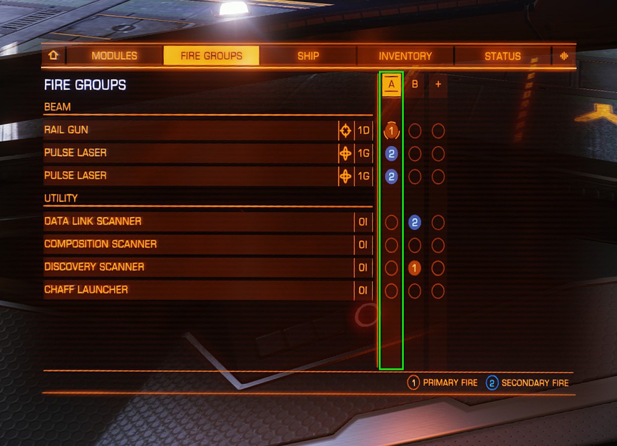 展開中の装備 武装であれば武装の名称と残弾数/最大弾数及び電力残量。 Fire-Groupsで設定した①が右側の「PRIMARY」に、②が左側の「SECONDARY」に表示される。横のAやBはグループ名。 Discovery Scanner、Kill Warrant Scanner、Frame Shift Wake Scanner、Frame Shift Drive Interdictor、各種ドローンなどもここ。