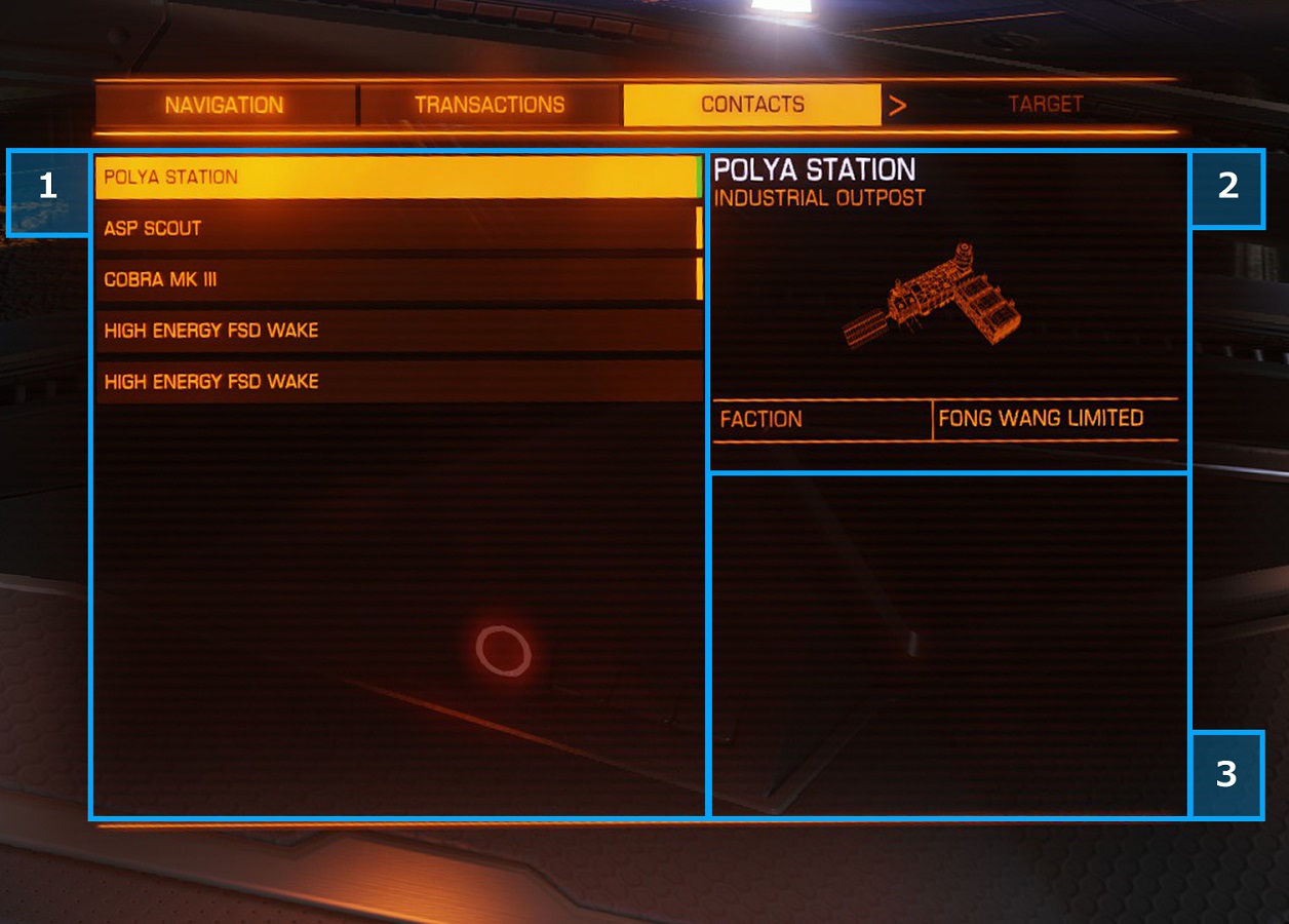 自船のいる『宙域区分』でセンサーが捉えている「各種ステーション」「NPC船」「CMDR船」のリスト。 選択(友好状況に依って色分けされる場合も)することによってコンタクトアクションを起こすことが出来る物がある