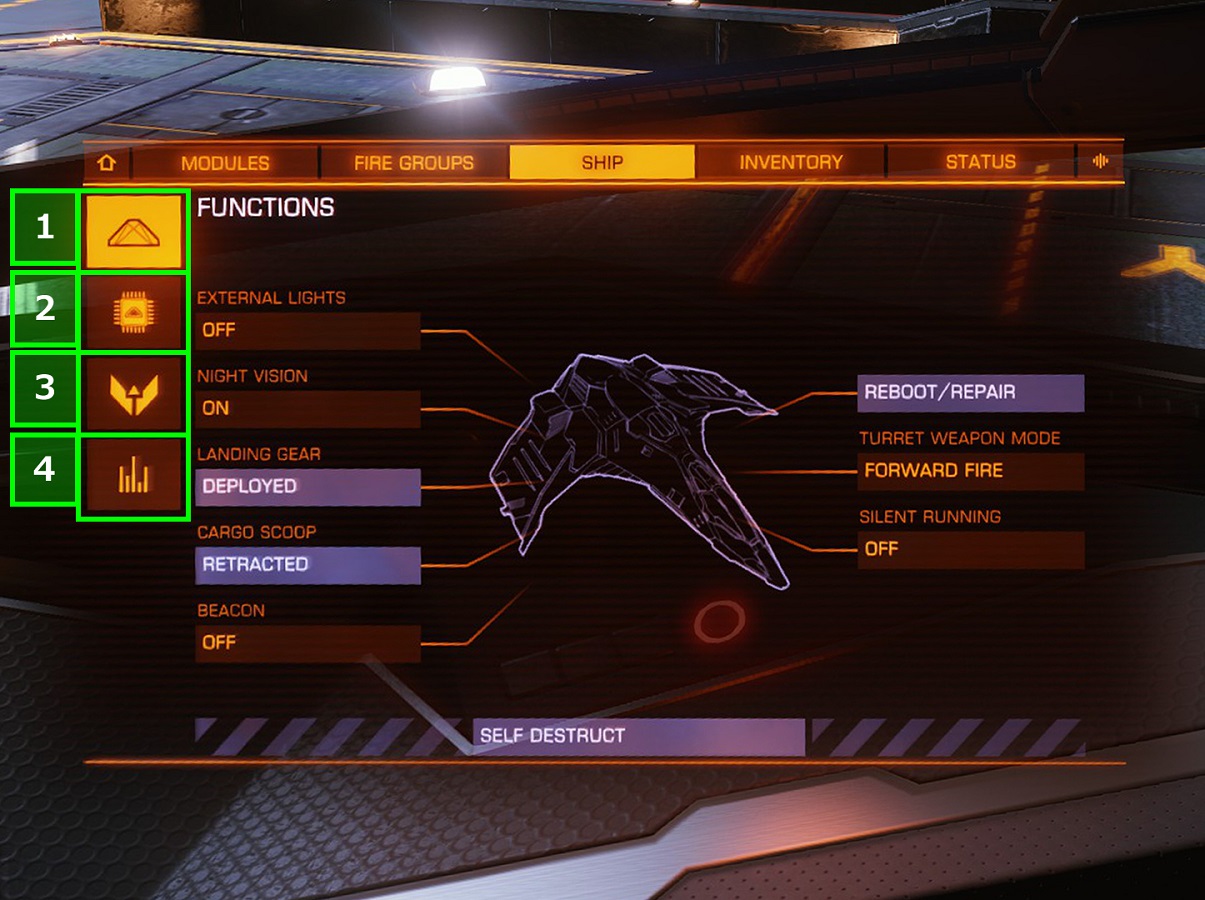 各種機能の使用および切替 FUNCTIONS EXTERNAL LIGHTS ライトのオン/オフ NIGHT VISION 物体の輪郭表示のオン/オフ LANDING GEAR ランディングギアの展開/格納 CARGO SCOOP 宇宙空間に漂う物品を回収するためのカーゴスクープの展開/格納 BEACON 自船の位置を知らせる装置のオン/オフ。Wings(分隊機能)を組んだ際に使用する。 REBOOT/REPAIR システムの再起動。0%になったモジュールを応急修理する(必ずではない) TURRET WEAPON MODE Turretマウント式兵器の照準モードの切り替え。 Forward Fire:正面固定射撃モード、『Fixed』と同等になる。 Targeted Enemy:照準追従射撃モード、スキャナー上でロックした敵が3km以内の場合、射撃開始後は自動追尾する。デフォルト。 Fire at Will:全自動迎撃モード、上下左右に十分な砲座を持つ戦闘艦向き。起動中は敵対行動を仕掛けた相手に自動反撃するため、友軍誤射の危険性を伴う。 2つ以上のタレットがある場合、「個別の敵性機」へ反撃する。 SILENT RUNNING サイレントランニングのオン/オフ 自船から発生する熱量・電力・シールドエネルギー等を全てオフラインにし、隠密飛行を行うモード。 これにより相手はロックオンができなくなる、レーダーに映り辛くなるなどの効果が得られ、使いこなせば戦闘時のかく乱などにも応用が利く強力な機能である。 一方、発動中は船体内熱量が上昇していくため、Heat Sink Launcherなどの対処無しでは短時間しか発動できず、前述の通り復帰後にはシールドリチャージし直しを行う為、運用は慎重に。 SELF DESTRUCT 自爆装置。扱いに注意。なお1度押すとすぐに自爆するわけではなく、選択後の最終確認を承諾すると自船のヒートレベルが200%以上のオーバーヒートレベルに強制設定され、数十秒後に爆発する警告と共に船は木っ端微塵となる。