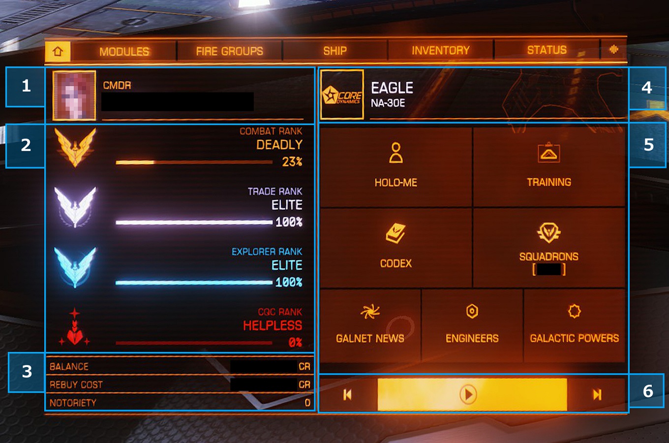 更に細かいCMDRの情報。左右選択で表示する各サブページの内容は以下の通り Reputation(評判) 勢力との友好度合いの詳細。上項目「REPUTATION」はE:D世界での3大勢力との友好度であり「RANK」項目は 「下部の%表記が100%になると、該当勢力から次のランクに昇格することが出来るミッションが出現する※」物である。下項目は近隣星系や滞在宙域の星系勢力との友好度を示している。 ※100%になってから固定されているように見えているが、裏で累計計算されている為「100%になった際に即ランク昇格を行わないと、オーバー分が無駄になる」事は一切無い。 System Status(星系の状況) 星系圏内の状態情報。他勢力との戦争状態・内戦状態もここに表記されている。現在の星系状況の詳細はこちらより Finance(融資枠や保険料など) INゲーム内の金銭関連情報。現在の所持金や、保険金の割引率等がここに記載されている。 Statics 戦闘・交易・探索における全ての詳細データが記載されている。各項目内容に関する詳細はCMDR Statisticsにて Permits(許可証) ミッションなどで受取済みの星系進入許可証の一覧。