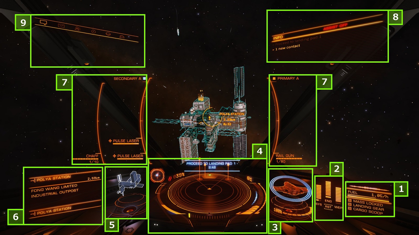 TARGET INFORMATION PANEL 現在ターゲットしている物の情報を表示するウィンドウ。 船であれば「名前(CMDRの後に名前があった場合、その船は他のプレイヤーが操縦している)・パイロットのランク・犯罪履歴(WANTEDかを判定できる)」等の情報が表示され ステーションの場合はエリアに進入する為のガイドが表示される。