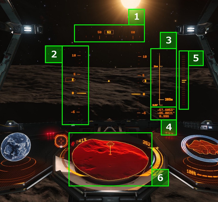 惑星地表面に着陸を行う際の地形ガイド表記。 画面中央に角度や英語メッセージにて指示も表記されているが、「ALIGNMENT OK」と表記されている場合はその下側の地表面には着艦可能、ということを示している。 ※着陸可能な場合の参考画像