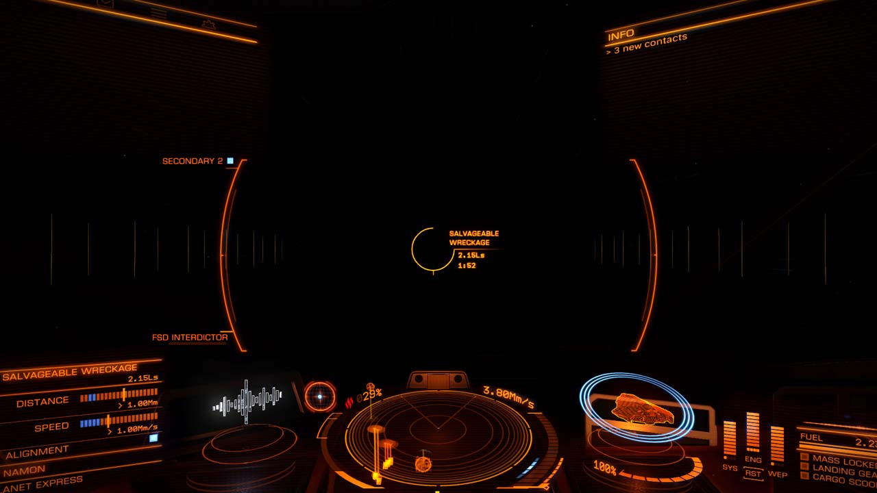 ミッションで指定された星系へ移動し、スーパークルーズモード中にランダムに発生する『SALVAGEABLE WRECKAGE(回収可能な残骸)』シグナルエリアが出現するまで待機。信号が発生した際には、ステーション宙域に進入を行う時と同用にエリアに進入する。